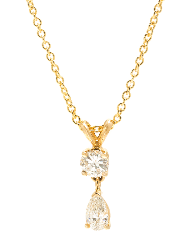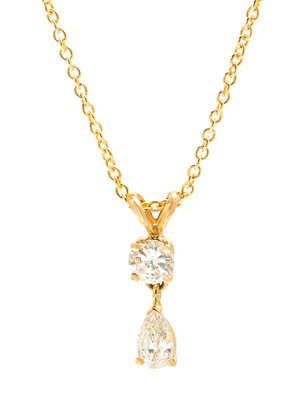 containing one round brilliant cut diamond weighing approximately 0.40 carat and one pear shape diamond weighing approximately 0.32 carat, suspended from a yellow gold cable chain necklace.Chain stamp: ALAD ITALY 14K.