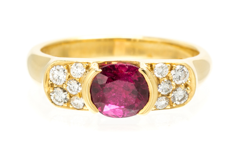 containing one oval mixed cut ruby weighing approximately 1.38 carats and 10 round brilliant cut diamonds weighing approximately 0.27 carat total.Engraved: 18K 1.38 rub ct. .27 ct dia.