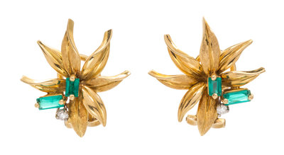A Pair of Yellow Gold, Emerald and Diamond Flower Earclips,