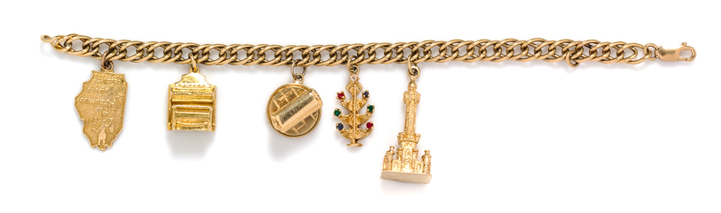 consisting of a 14 karat gold Chicago watertower charm, a yellow gold and multigem Christmas tree, a 14 karat trolley turntable charm, a 14 karat gold upright piano charm and a 14 karat gold Prairie State Illinois charm.