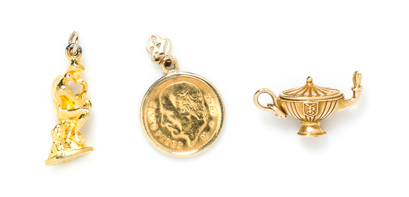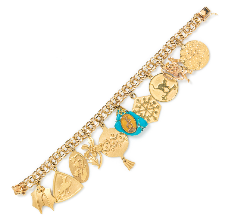 containing a 14 karat Xmas 1969 charm, a Hawaii 1973 charm, a 14 karat 1976 Cat Cay charm, a 14 karat Xmas 1970 charm, a turquoise YPO 1971 charm, a 14 karat YPO Xmas 1971 charm, a 14 karat spring YPO 1971 flower charm, a 14 karat spring 1970 spring YPO charm, a 14 karat spring YPO 1972 charm, a 14 karat Xmas 1972 charm, a 1955 Mexican Cinco peso coin charm, a yellow gold genie lamp charm together with a 1972 gold tone David charm.