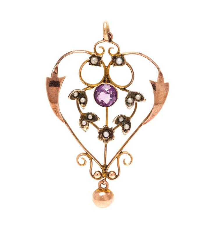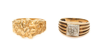 consisting of a 10 karat yellow gold nugget style ring, a 10 karat yellow gold ring containing seven round single cut diamonds, together with a 9 karat yellow gold pendant containing one round mixed cut amethyst measuring approximately 5.25 mm in diameter and 11 seed pearls (origin not tested).