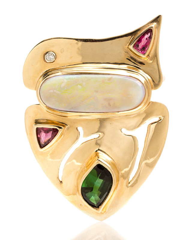 A 14 Karat Yellow Gold, Opal, Tourmaline and Diamond Brooch,