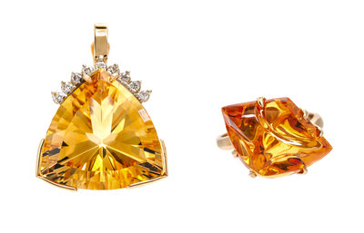 consisting of a 10 karat yellow gold ring containing one fantasy cut citrine measuring approximately 20.73 x 14.97 mm together with a pendant/enhancer containing one triangular shape mixed cut citrine measuring approximately 21.53 x 21.59 x 11.63 mm and nine round brilliant cut diamonds weighing approximately 0.22 carat total.
