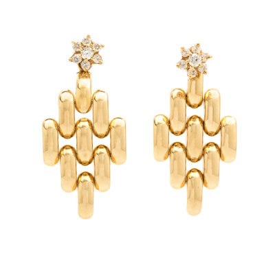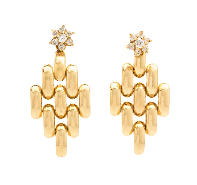 consisting of a pair of stud earrings containing 14 round mixed cut clear stones with detachable brick link earring enhancers. Stamp: 14K. (maker's mark).