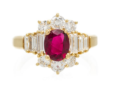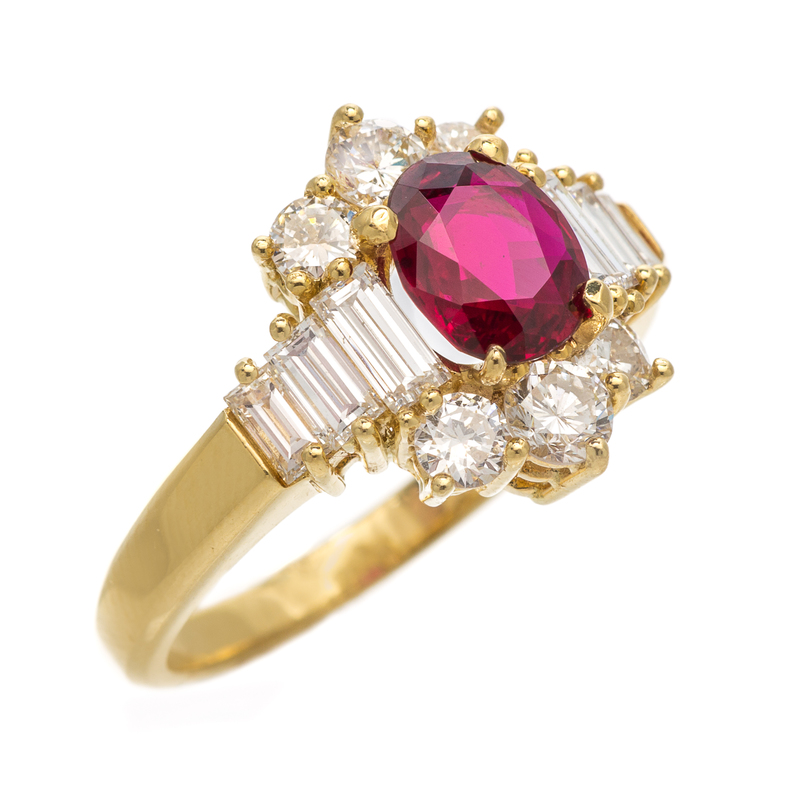 containing one oval mixed cut ruby weighing approximately 1.18 carats, six baguette cut diamonds weighing approximately 0.76 carat total and six round brilliant cut diamonds weighing approximately 0.64 carat totalStamp: 750.