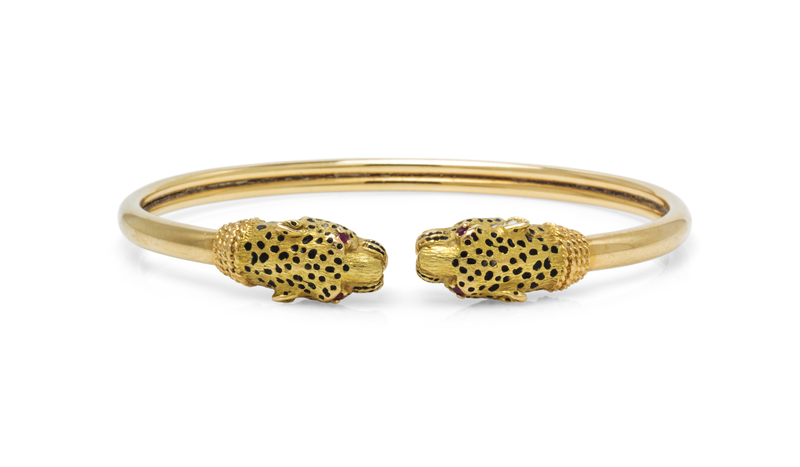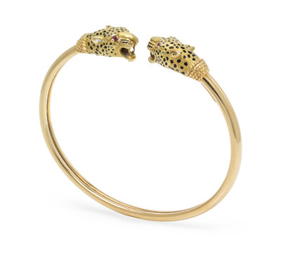 in a flexible style consisting of panther head finials with black enamel accents and four round cut rubies.Stamp: FRANCE 18K (maker's mark).