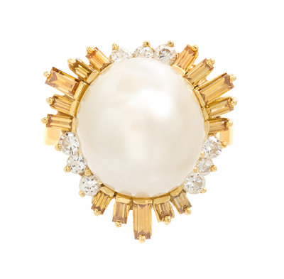 An 18 Karat Yellow Gold, Cultured Pearl, Colored Diamond and Diamond Ring,