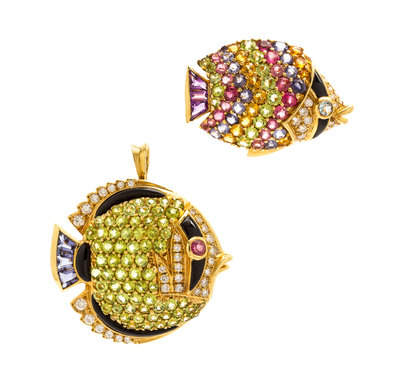 consisting of two brooches depicting tropical fish, the larger containing numerous round mixed cut peridot, three calibre cut iolite, one round mixed cut pink tourmaline eye, five inset onyx plaques, and numerous round brilliant cut diamonds weighing approximately 0.50 carat total, together with a brooch containing numerous round mixed cut pink tourmaline, iolite, citrine and peridot, three claibre cut amethyst, two inset onyx plaques, and numerous round brilliant cut diamonds weighing approximately 0.25 carat total.