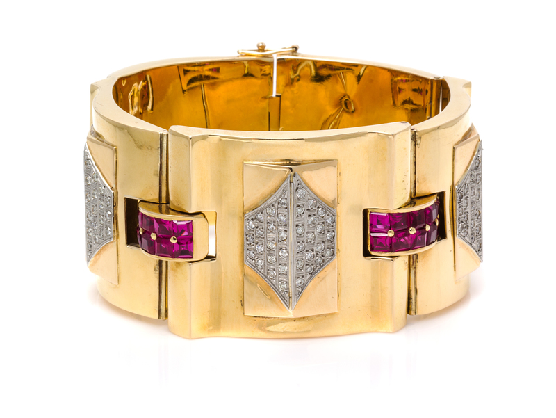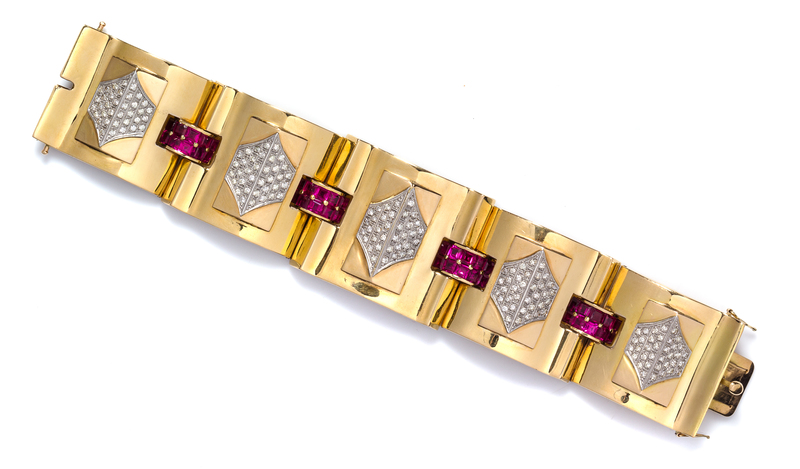 consisting of five sculpted hollowform gold links, each surmounted with a white gold diamond set peaked chevron, the chevrons containing numerous round brilliant cut diamonds weighing approximately 2.70 carats total, the links joined with domed links containing 40 square step cut synthetic rubies, the bracelet measuring approximately 39.00 mm wide.