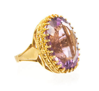 containing one oval mixed cut amethyst measuring approximately 23.61 x 12.23 x 11.04 mm in an openwork filigree setting.