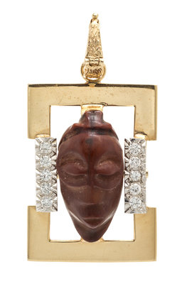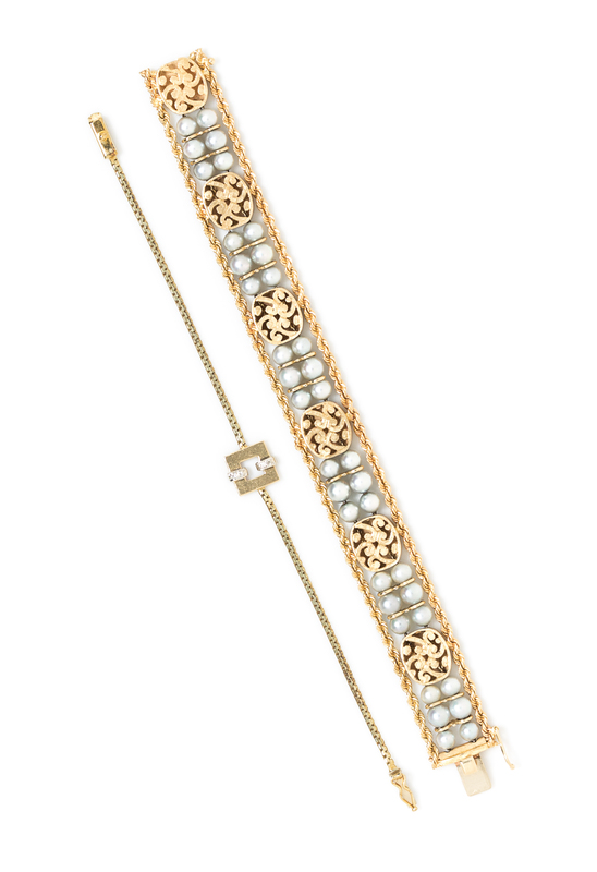consisting of an 18 karat yellow gold carved wood pendant in an open frame containing ten round brilliant cut diamonds weighing approximately 0.30 carat total, a 14 karat gold bracelet containing four round single cut diamonds weighing approximately 0.04 carat total, together with a bracelet consisting of two lengths of rope chain framing a central double strand of pearls containing 36 pearls measuring approximately 5.80 mm in diameter and interspersed with gold slides.