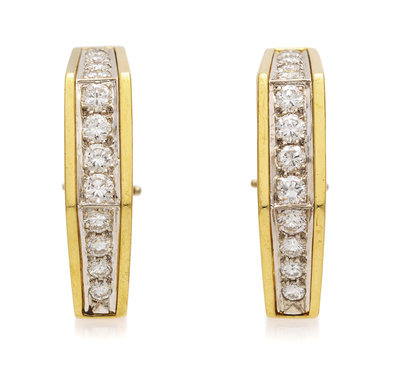 A Pair of 18 Karat Yellow Gold and Diamond Hoop Earclips,