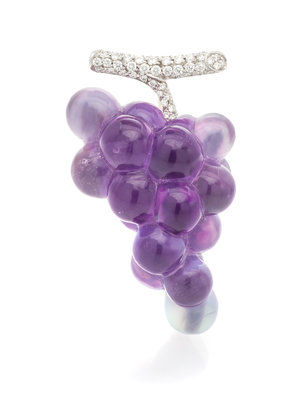 in a grape cluster motif, consisting of a carved amethyst over a mother-of-pearl plaque against a yellow gold backing, the white gold stem containing numerous round brilliant cut diamonds weighing approximately 0.50 carat total.Stamp: VHERNIER 750 (Italian maker's mark 2117 AL).