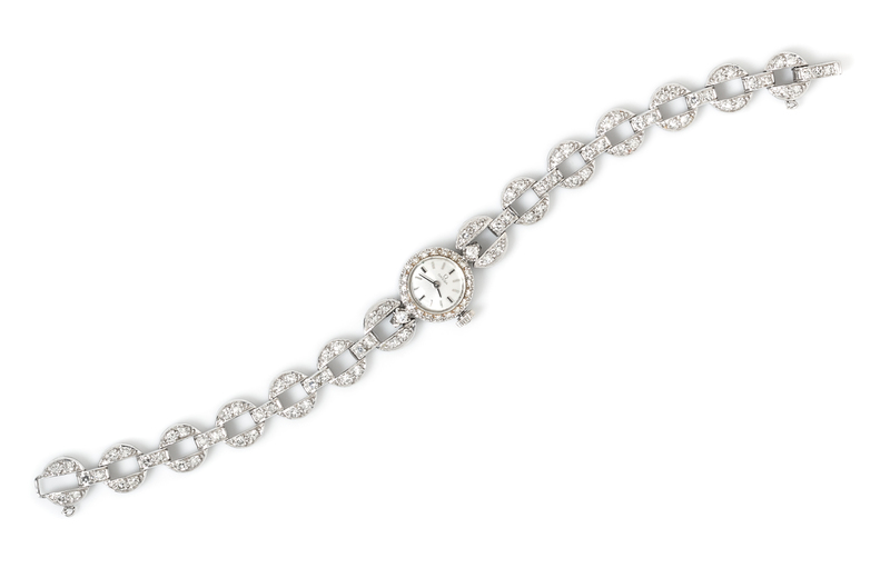 the case and bracelet containing numerous round brilliant and round single cut diamonds weighing approximately 1.92 carats total, 14.00 mm case diameter, matte silvered dial signed OMEGA, applied silver index numerals, black enamel pencil hands, manual wind 17 jewel movement signed OMEGA, platinum bracelet with foldover clasp.Movement number: 23668911.Case back stamp: 14KGOLD.Clasp: IRID.PLAT.