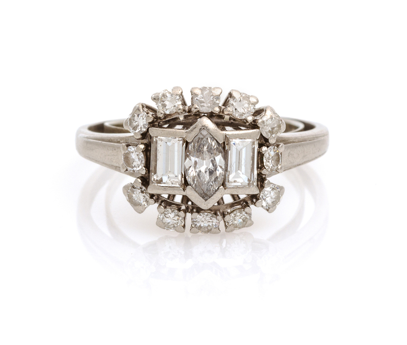 containing one marquise cut diamond weighing approximately 0.28 carat, two baguette cut diamonds weighing approximately 0.40 carat total and 12 round brilliant cut diamonds weighing approximately 0.42 carat total.Stamp: 10% IRID PLAT.