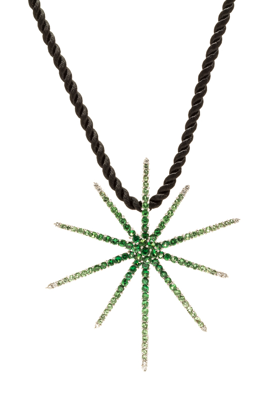 containing 121 round mixed cut tsavorite garnet and 15 round brilliant cut diamonds weighing approximately 0.30 carat total, suspended from a black cord.Stamp: 18K.