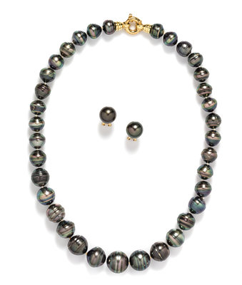 consisting of a necklace containing 35 graduated baroque Tahitian pearls measuring approximately 11.00-16.25 mm in diameter strung knotted with a 14 karat yellow gold clasp together with a pair of earclips containing two Tahitian pearls measuring approximately 12.50 mm in diameter. Clasp stamp: 585Earclip stamp: 14K.