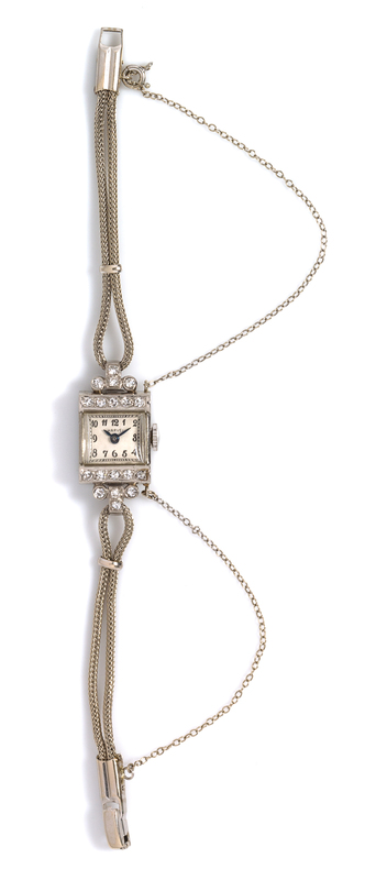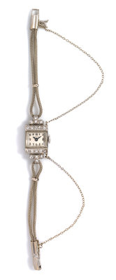 the bezel and lugs containing 18 round single cut diamonds weighing approximately 0.54 carat total, 13.00 x 17.00 mm case dimensions, matte silvered dial signed HARVEL, Arabic numerals, blued steel feuille hands, snap on case back, manual wind 17 jewel mechanical movement signed Harvel, 14 karat white gold mesh strap with box clasp.Inner case back stamp: RUTHENIUM PALLADIUM.Clasp stamp: 14KT GOLD.