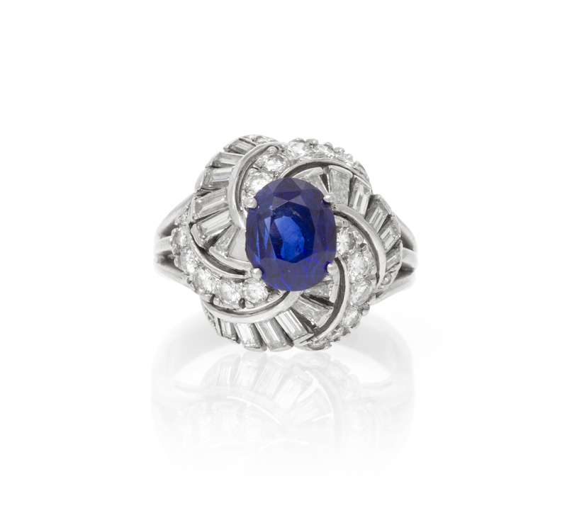 containing one oval mixed cut sapphire measuring approximately 8.69 x 6.83 x 5.90 mm, 18 straight and tapered baguette cut diamonds weighing approximately 0.81 carat total and 21 round brilliant cut diamonds weighing approximately 0.54 carat total.