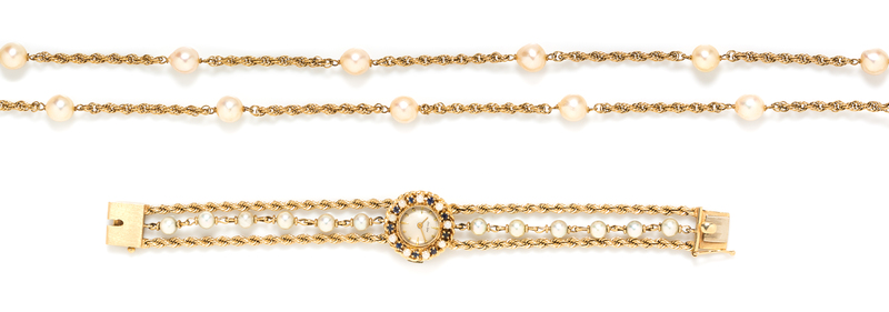 consisting of a necklace containing 13 pearls measuring approximately 8.00-8.25 mm in diameter, interspersed in a rope chain and a yellow gold, cultured pearl and sapphire wristwatch by Jean Sybe, the bracelet containing 12 pearls measuring approximately 5.50 mm in diameter, the bezel set with nine round mixed cut sapphires measuring approximately 1.45 mm in diameter and nine pearls measuring approximately 2.40 mm in diameter.Watch caseback stamp: 14K.