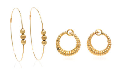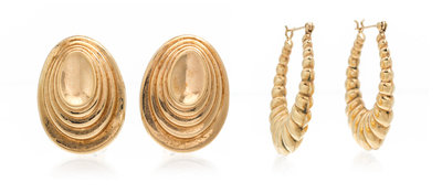 consisting of a pair of gold wire hoop earrings suspending gold balls, a pair of oval fluted earclips, a pair of ribbed sideways hoop earclips together with a pair of ribbed hoop earrings.