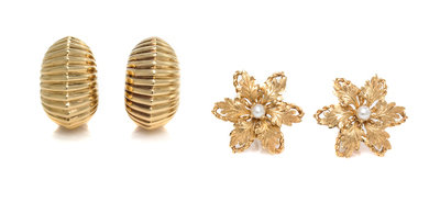 A Collection of 14 Karat Yellow Gold and Cultured Pearl Earclips,