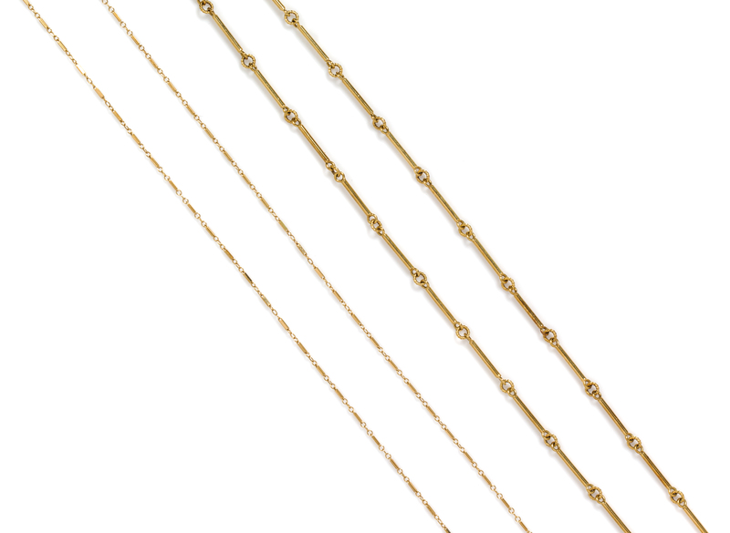 consisting of one bar link longchain necklace measuring approximately 1.07 mm in width together with a 14 karat bar link chain measuring approximately 1.77 mm in width.Stamp: 14KT.