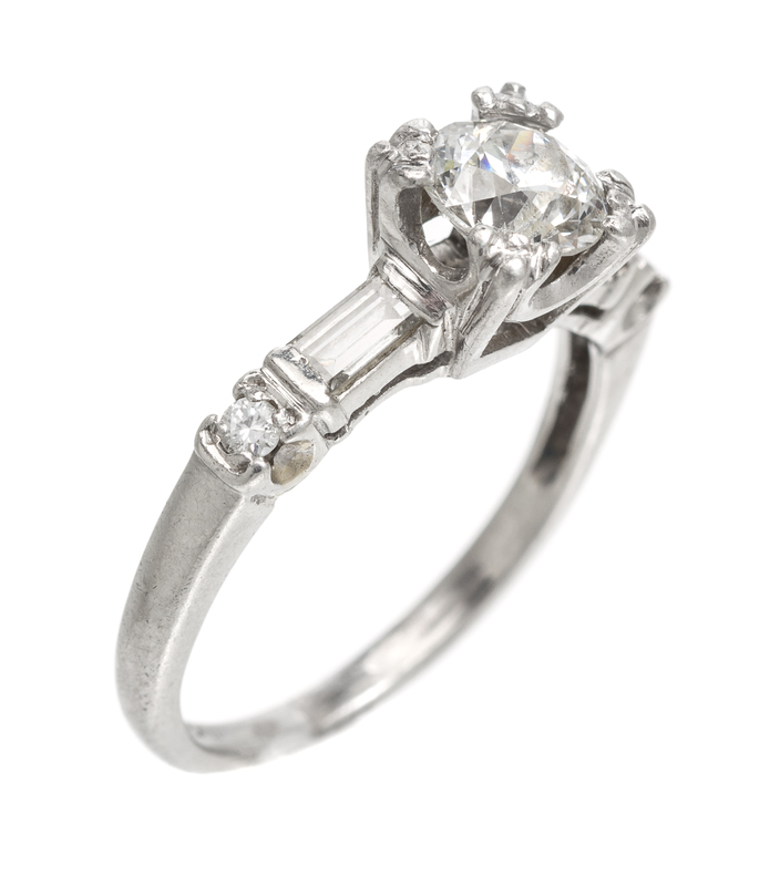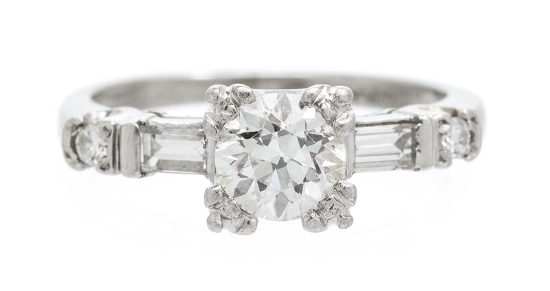 containing one old European cut diamond weighing approximately 0.77 carat, two straight baguette cut diamonds weighing approximately 0.24 carat total and two round brilliant cut diamonds weighing approximately 0.06 carat total. Stamp: 10 Irid Plat.
