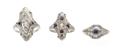 consisting of one ring containing one round mixed cut sapphire measuring approximately 2.44 mm in diameter, one ring containing three round brilliant cut diamonds and two triangular cut synthetic sapphires, and one ring containing one old European cut diamond weighing approximately 0.06 carat, two round cut synthetic sapphires and two triangular cut synthetic sapphires.