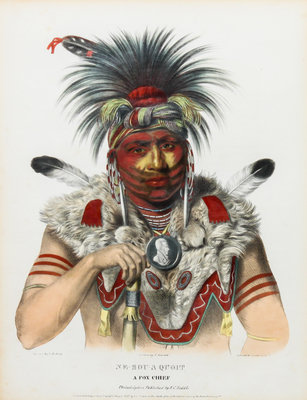 A lithograph with hand coloring from the History of the Indian Tribes of North American, Frederick W. Greenough, Philadelphia, pub. Ne-Sou-A Quoit, A Fox Chief. Matted and framed.