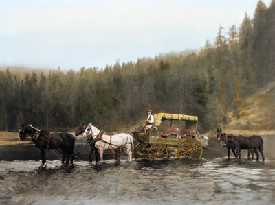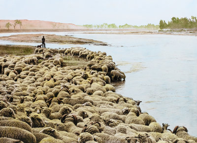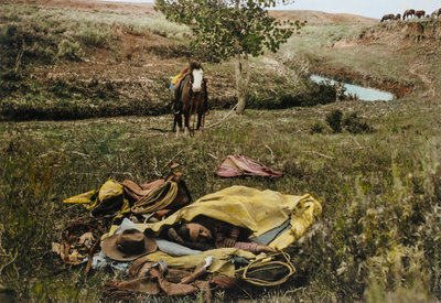 Two hand colored photo murals, including Night Hawk In His Nest, and Sheep By the Water together with another Western image by unknown photographer, each unframed.