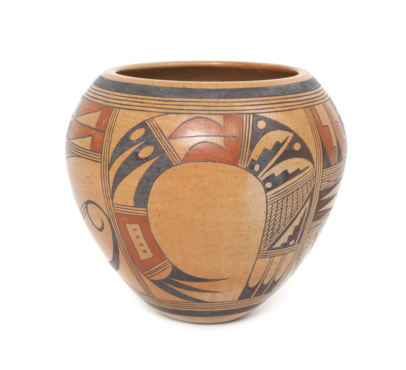 a polychrome jar with four panels of rain bird design, signed Rondina Huma.