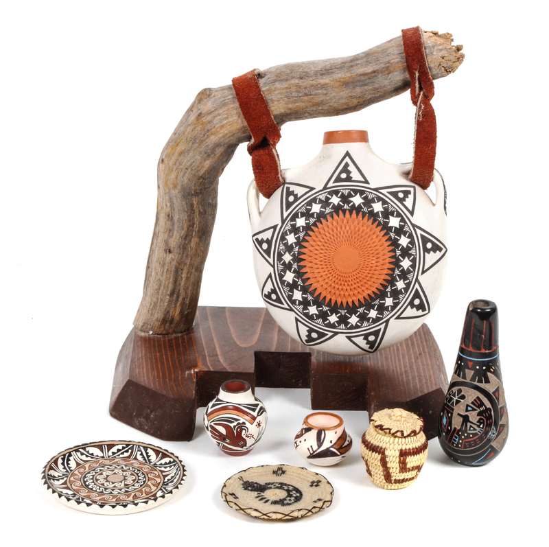 a polychrome canteen having geometric fine line and textured decoration, signed A. Roy Keene within a feather symbol and suspended from a wooden holder with leather straps together with six miniature items including a lidded basket, a basket with snake decoration, a platter signed C. Bogulas, an Isleta jar, an Acoma olla signed B.J. Cerno and a Santa Clara polychrome vessel with geometric deer decoration.