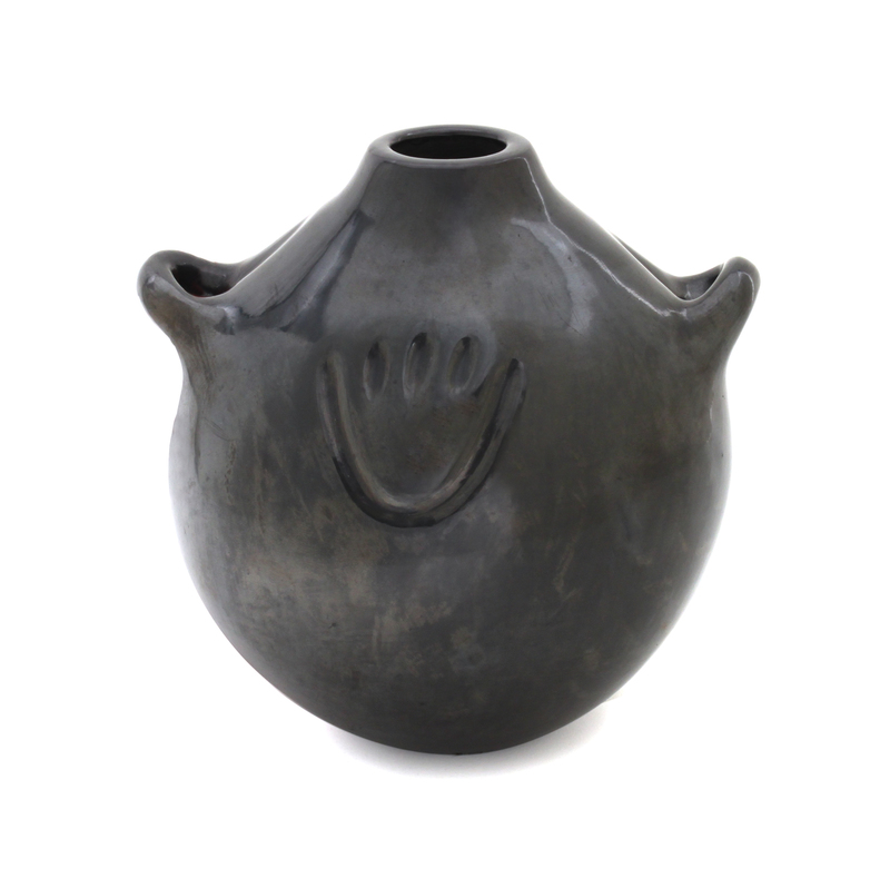 a blackware canteen with gun metal surface and impressed bear paw, signed Margaret Tafoya Santa Clara Pueblo N. Mexico.