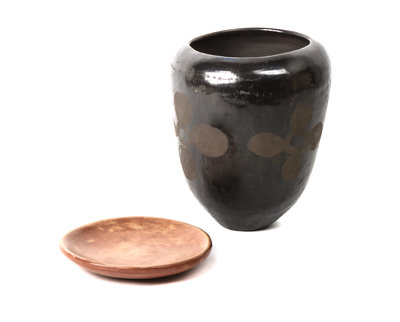 having four petal flowers, together with a San Ildefonso redware plate, signed "Maria."
