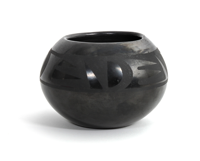 a small black on black jar signed Marie & Santana.