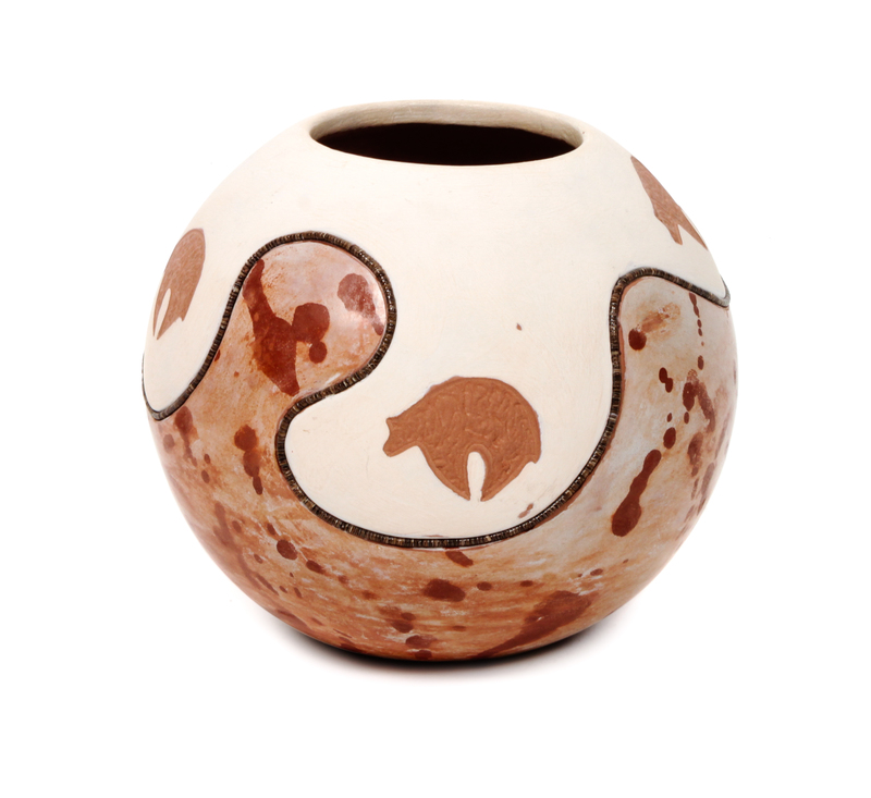 a redware pot with sgraffito bear motif and fine heishi shell and splatter design, signed Russell Sanchez with bear symbol.