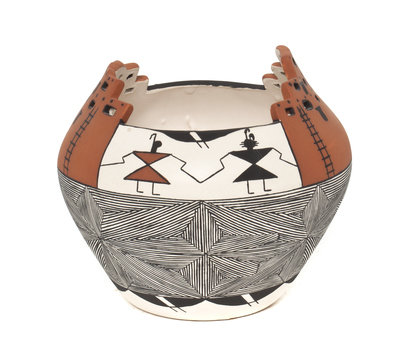 a polychrome jar with terraced rim depicting a Pueblo with flanking reserves with figure decorations, all above fine line decoration, signed Acoma, N.M. by Dorothy Sanchez/JRS.