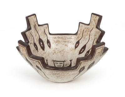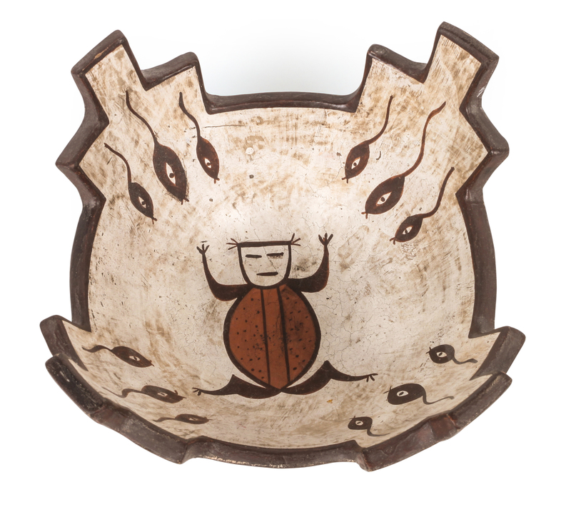 a polychrome ceremonial bowl with kiva carved rim having frog and tadpole decoration overall, signed Albert Eustace.