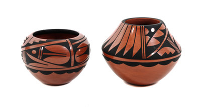two redware vessels having classic design in black, each signed C. G. Loretto, Jemez.