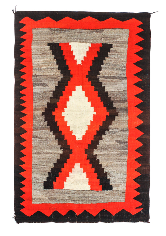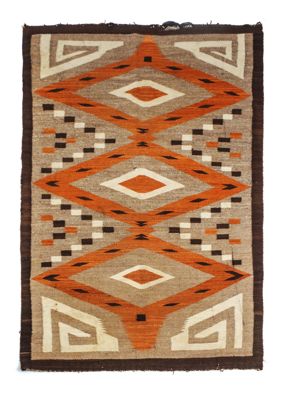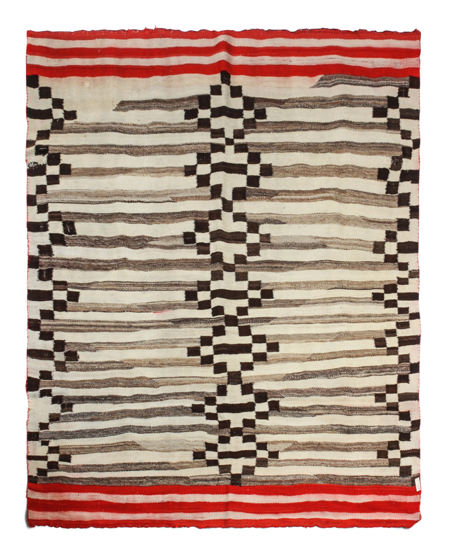 the first having a grey and white banded background with serrate checkerboard design, the second having three elongated medallions within a red and black saw tooth boarder and the third a Crystal having three medallions with serrate squares and rhomboid designs.