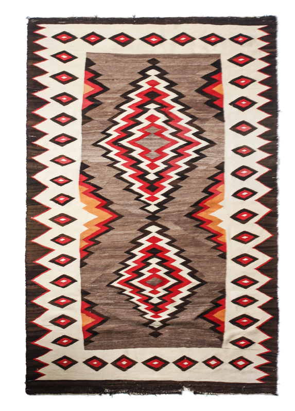 having two concentric serrate medallions with floating diamonds within a zig zag border.