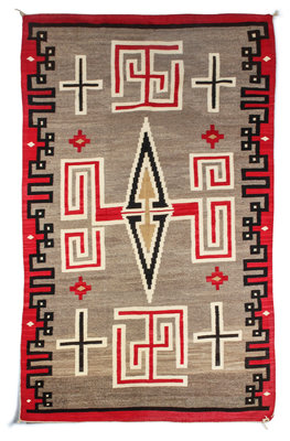 having elongated central medallion with crosses in each corner and maze designs in red and white.