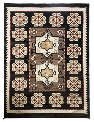 finely woven in classic oriental rug design, having two central medallions on a gray ground, the border with complicated snowflake design.