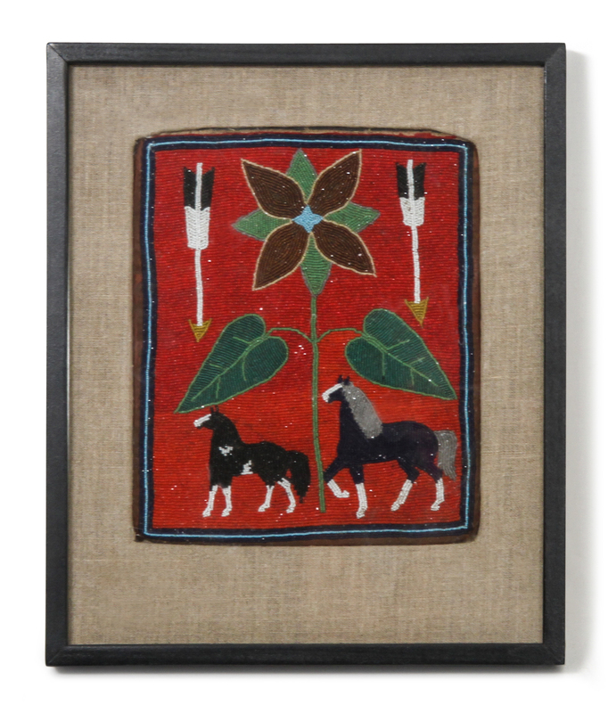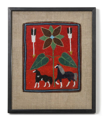 having central plant design flanked by two horses and arrows showing extensive use of cut beads, framed.
