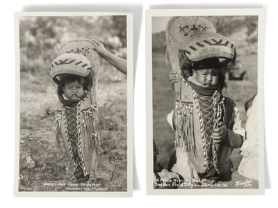 having basketry framework and visor embellished with black and red thread, beaded floral designs in light and dark blue, yellow, orange, green and white, the fringe decorated with glass beads; together with two postcards with a photo of a baby in the cradle board.