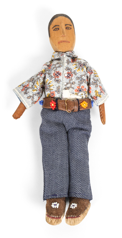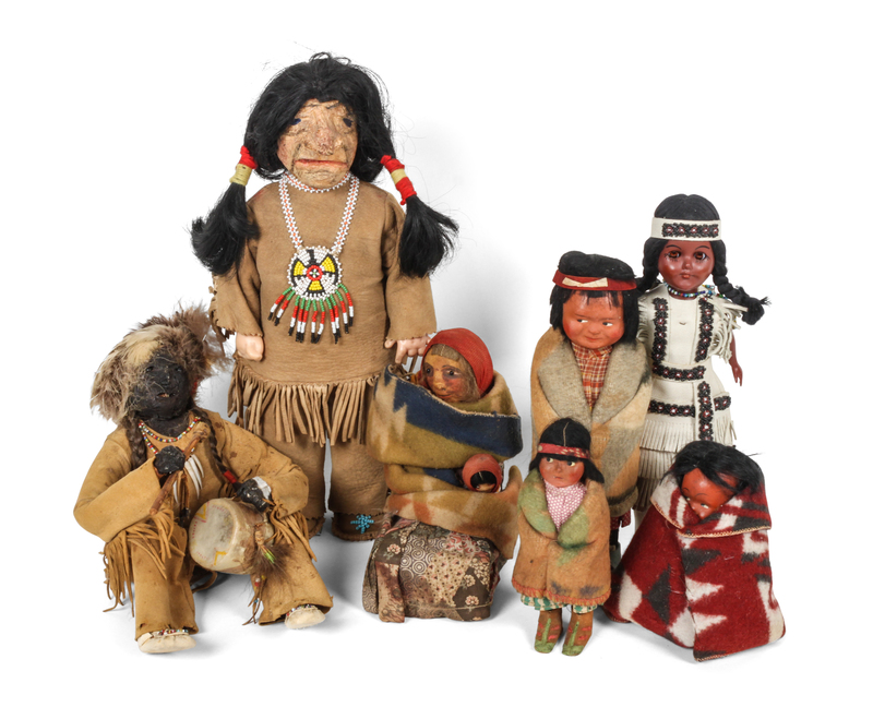 including three small Skookum dolls and four other dolls in Native American dress.
