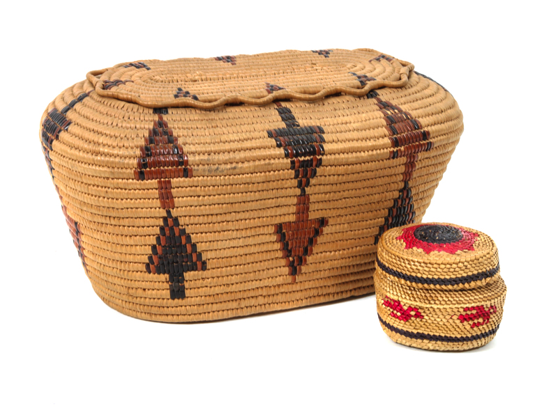 of oval form decorated with embricated pine tree design, together with a Makah lidded basket.