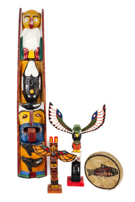 the first a carved and painted totem pole by Gordon Peters, dated 1978, the second a smaller totem made for the tourist trade, the third a large non-native carved totem and a hand drum decorated with a polychrome salmon.